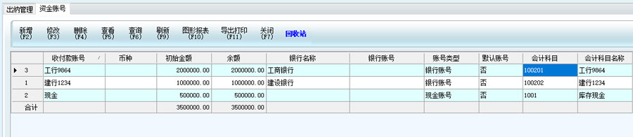 1、初始工作:出納管理→資金賬號,創建賬號和錄入初始金額(即開賬之前的賬號余額)