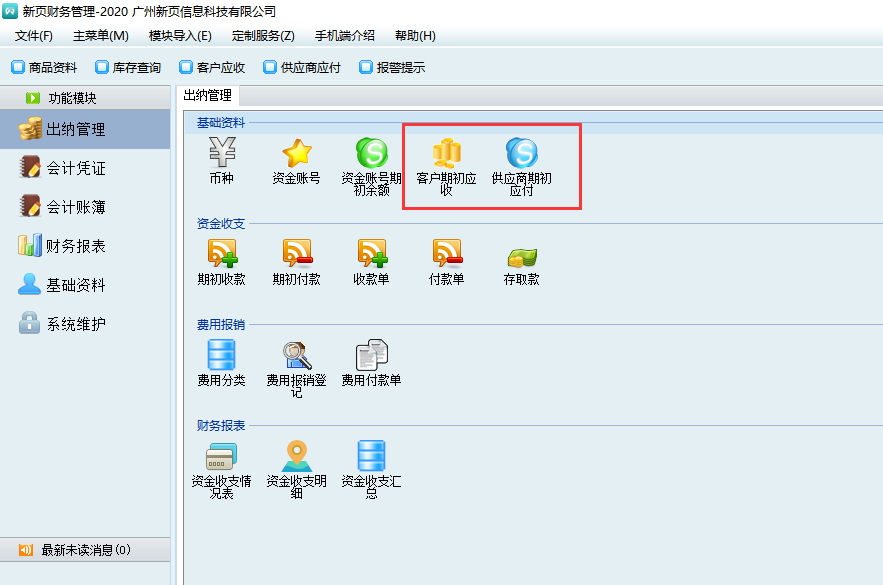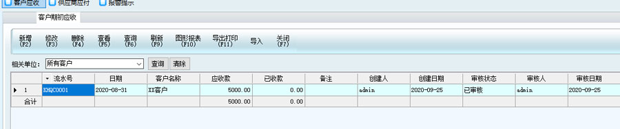 2、在使用軟件之前如果有客戶期初欠款和供應商期初欠款,分別在出納管理的客戶期初應收和供應商期初應付錄入,比如XX客戶期初欠款5000元