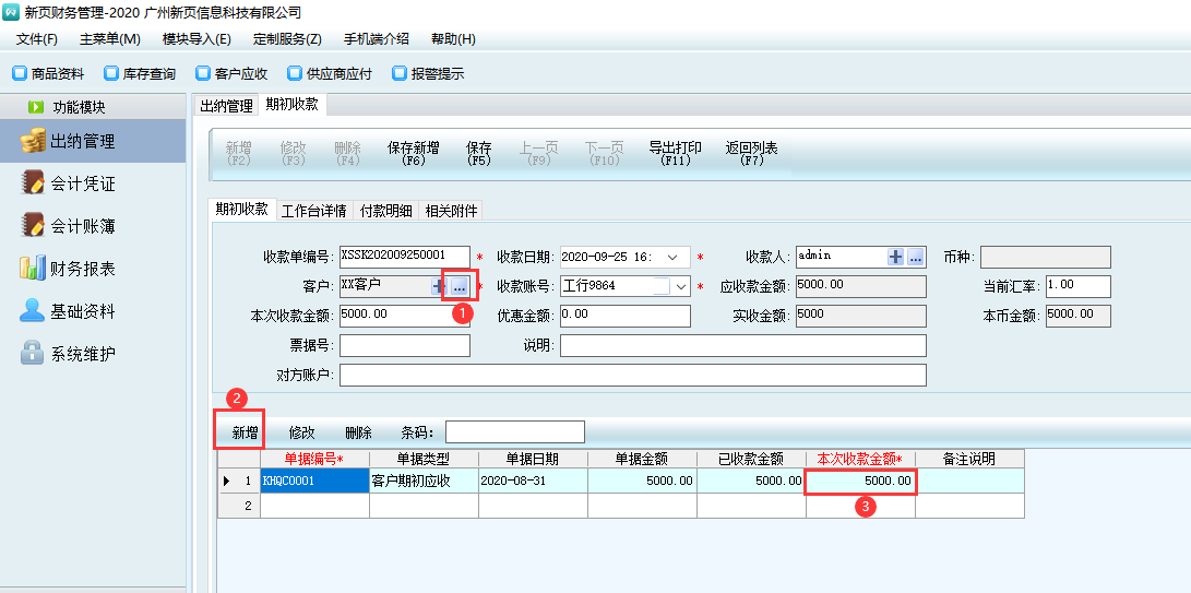 3、后期收到客戶期初欠款需要核銷,在出納管理的期初收款里面操作,如核銷XX客戶期初欠款5000元:
