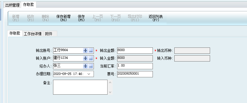 5、銀行賬戶之間轉賬,或者從銀行提現在出納管理里面做存取款單: