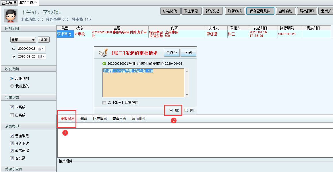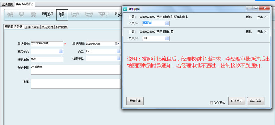 6、企業員工經常會有一些費用需要報銷,比如業務員張三報銷差旅費,需要經過經理審批出納才能付款,那么張三或者出納要先做費用報銷登記,然后發起審批流程,經理審批通過,則出納收到付款通知,最后出納到費用付款里面引用費用報銷登記做付款。操作步驟如下: