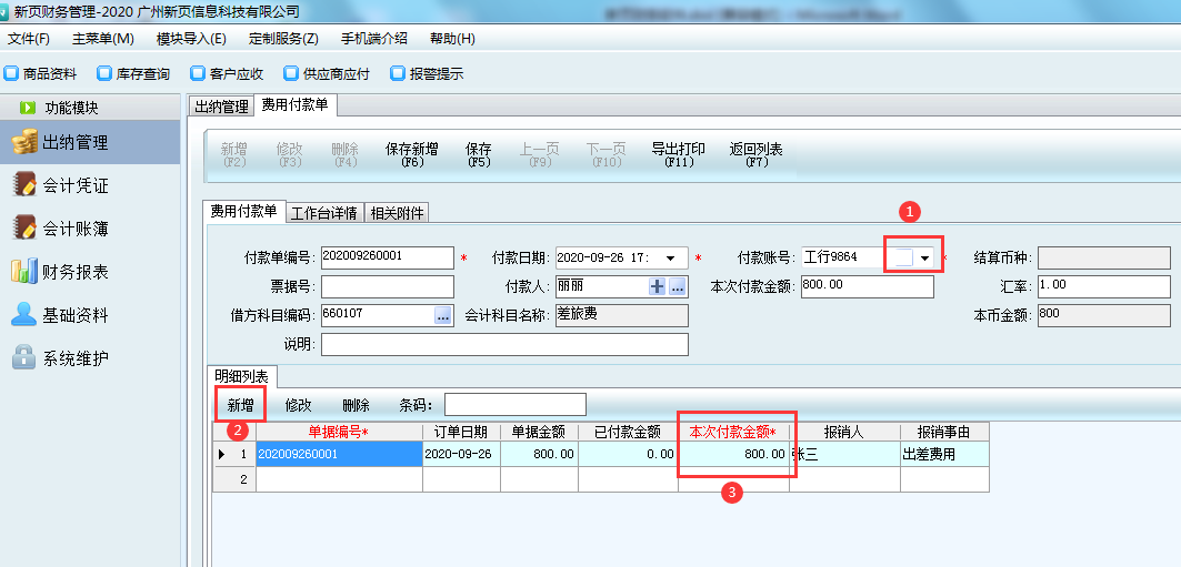 ④經理審批通過后,出納收到付款通知后到費用付款單里面做付款: