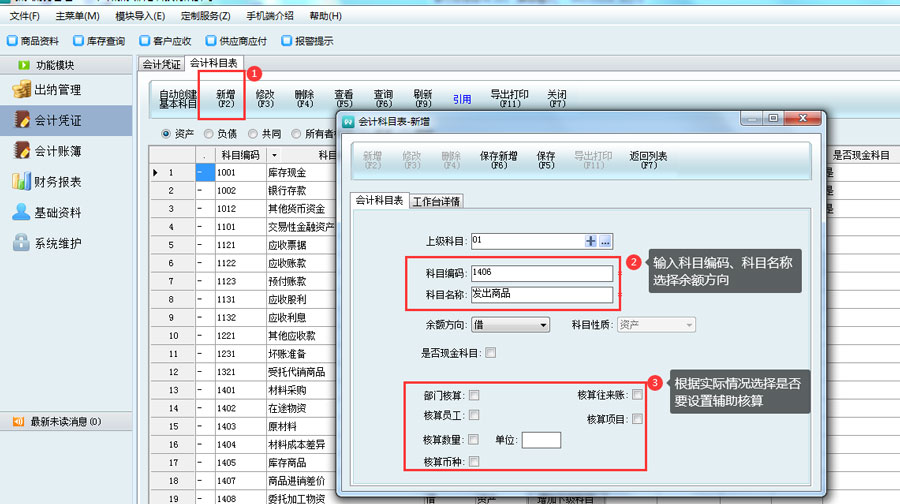 ①新增一級科目,比如添加“發出商品”這個會計科目: