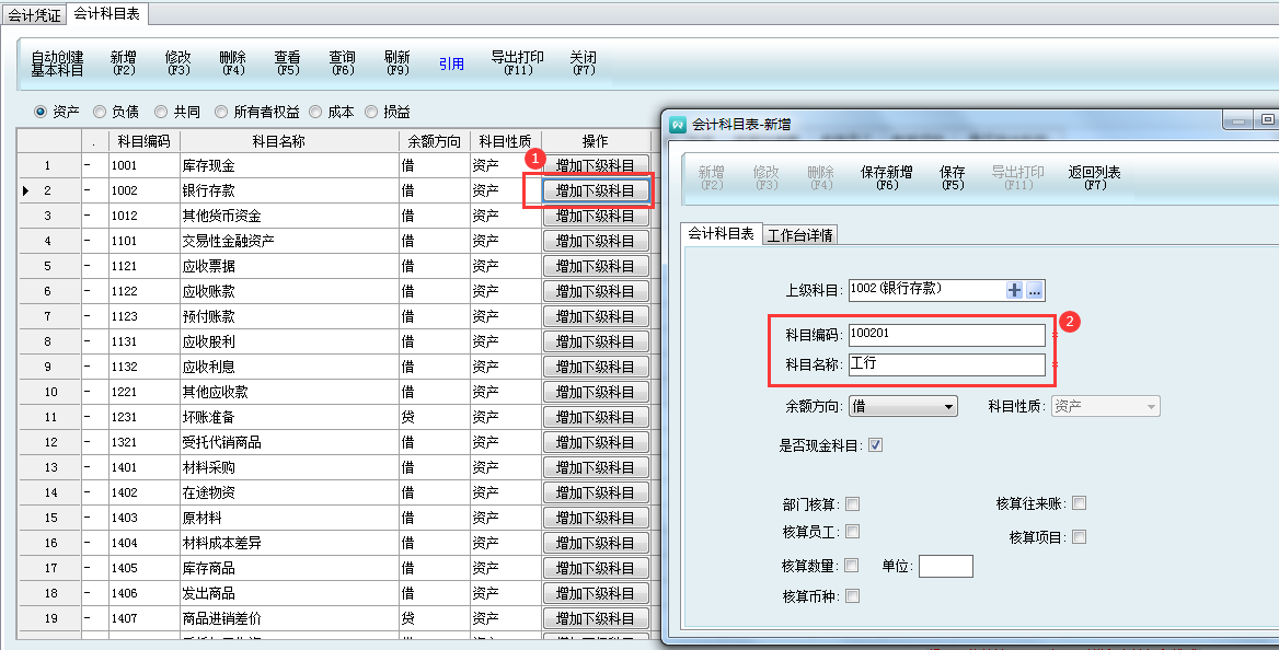 ②新增明細科目:比如銀行存款會計科目下面需要增加明細科目工行和建行: