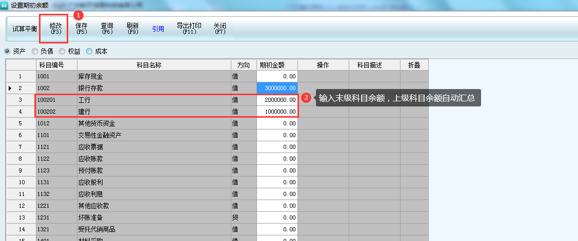 ③科目初始余額可隨時修改,但必須確保試算平衡,否則資產負債表不平