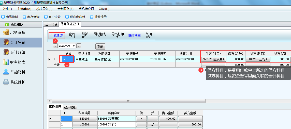 ①出納管理模塊的每筆收款單、付款單、費用付款單都會自動生成待開憑證,在會計憑證-待開憑證里面可查看,從待開憑證里面可直接生成正式憑證,比如費用付款單生成的憑證如下: