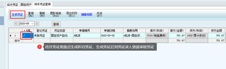 ②固定資產保存后在會計憑證-待開憑證查詢里面生成計提折舊憑證:
