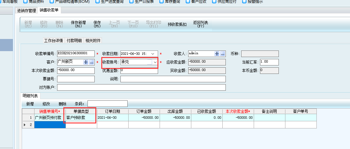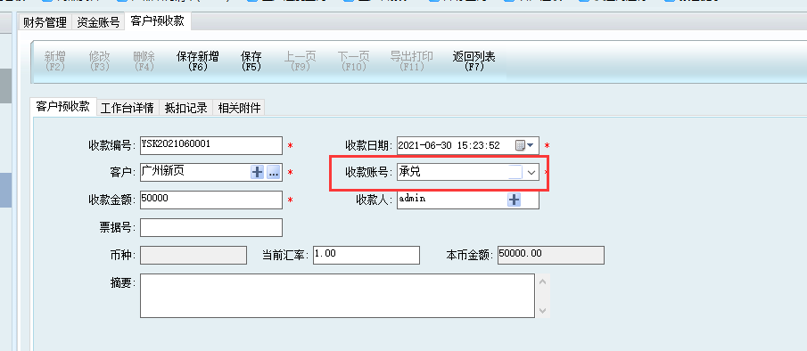 2、收到銀行承兌匯票,比如收到訂單貨款50000元的銀行承兌匯票:在財務管理—客戶預收款里面做一筆客戶預收款單,收款賬號選擇“承兌”如下: