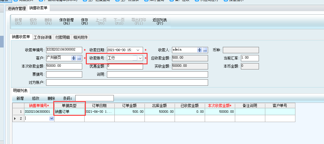 ②再做一張銷售收款單,選擇訂單收款,收款賬號選擇公司賬號如“工行”
