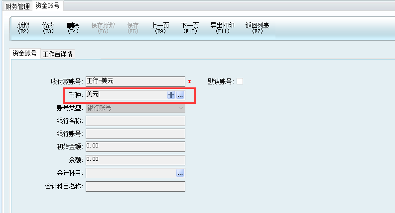 2、【財務管理】-【資金賬號】里面創建一個外幣賬號,選擇關聯幣種