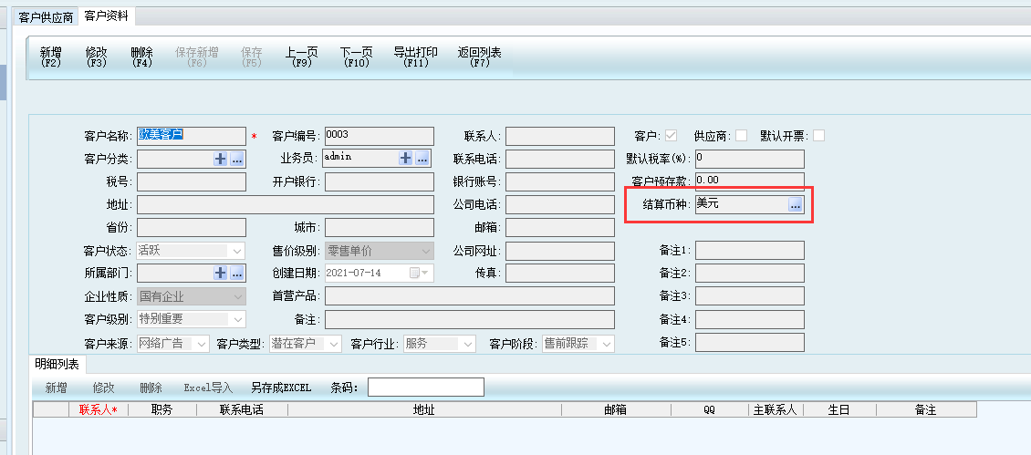 3、【客戶資料】里面給外幣客戶選擇對應的幣種
