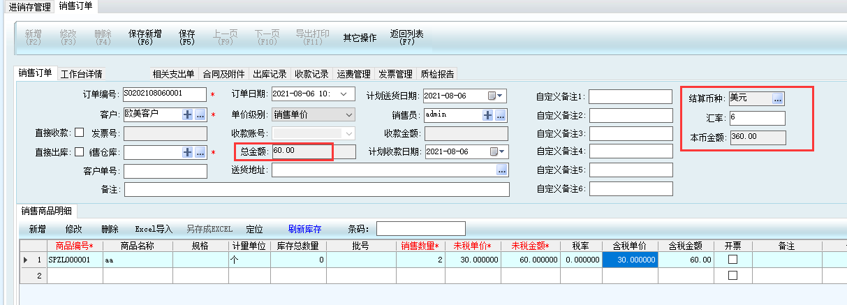 4、下達訂單時,訂單上選擇客戶后會自動帶出對應的幣種,訂單上的單價輸入外幣單價,比如美元