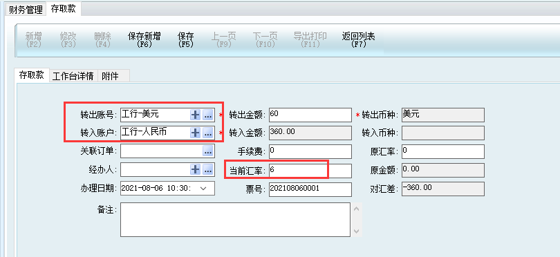 6、把收到的外幣貨款轉成人民幣,在【財務管理】-【存款款】里面把金額從外幣賬號轉到人民幣賬戶,結算的時候匯率可以手動更改
