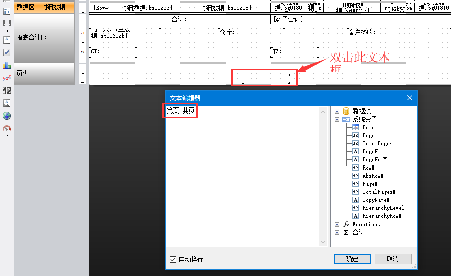 4、雙擊文本框,彈出窗口文本編輯器,在文本編輯器中輸入“第頁(yè) 共頁(yè)”