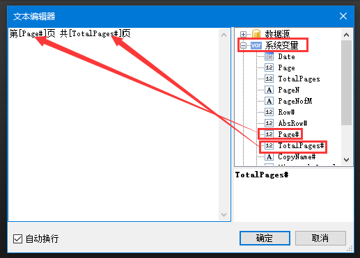 5、把光標(biāo)放在第和頁(yè)中間,然后雙擊右邊的系統(tǒng)變量的Page#,可見[Page#]就加到了第和頁(yè)之間。把光標(biāo)放在共和頁(yè)中間,然后雙擊右邊的系統(tǒng)變量的TotalPages#,可見[TotalPages#]就加到了共和頁(yè)之間。然后點(diǎn)擊確定。