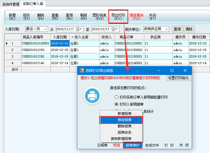 1、菜單欄點(diǎn)擊導(dǎo)出打印,彈出窗口,點(diǎn)報(bào)表維護(hù)-修改報(bào)表