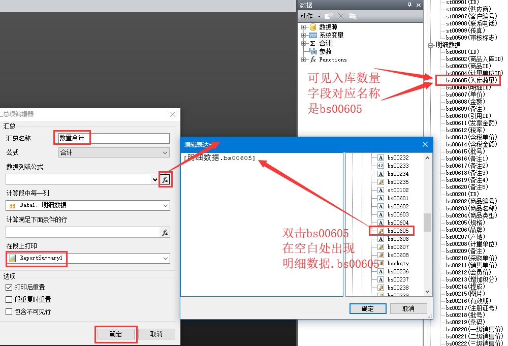 3、在彈出的窗口中,匯總名稱填上數(shù)量合計(jì),數(shù)據(jù)列或公式點(diǎn)擊fx符號(hào),會(huì)再?gòu)棾鲆粋€(gè)窗口——編輯表達(dá)式,在編輯表達(dá)式這個(gè)窗口中右邊點(diǎn)數(shù)據(jù)源—明細(xì)數(shù)據(jù),找到bs00605,雙擊bs00605,然后點(diǎn)擊確定,回到匯總編輯器的窗口,在段上打印選擇“ReportSummary1”,然后點(diǎn)擊確定。