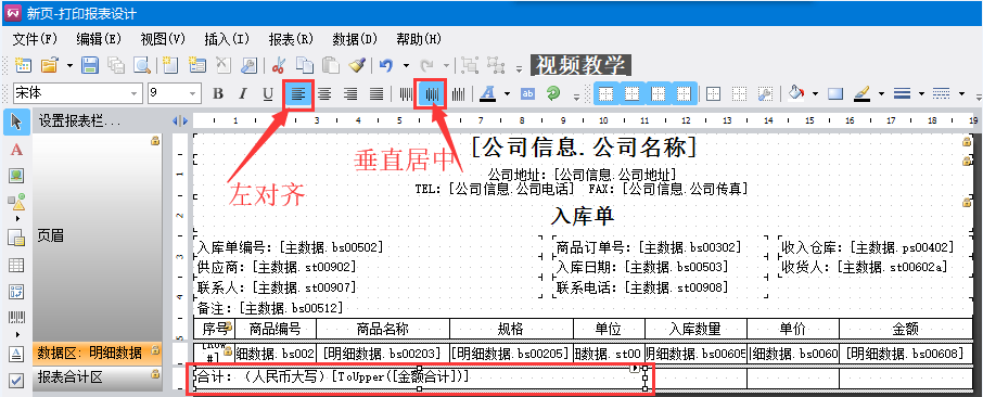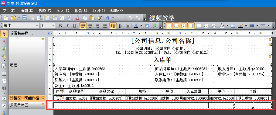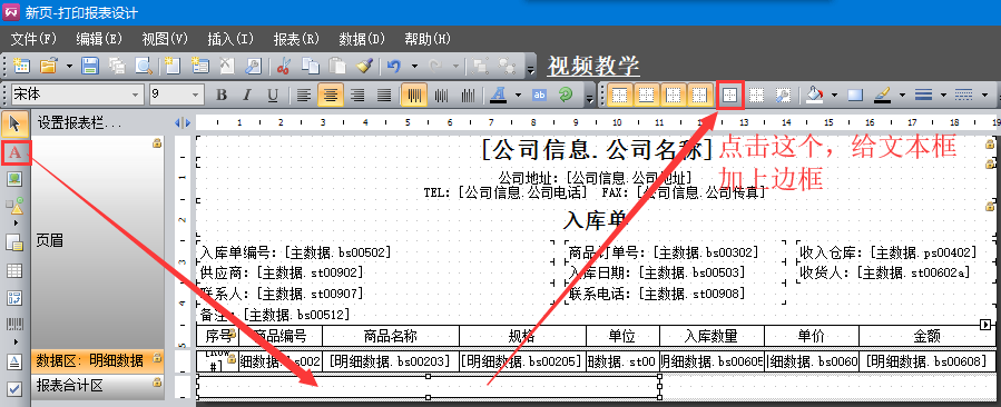 5、左側(cè)工具欄,點(diǎn)擊A符號(hào),在報(bào)表合計(jì)區(qū)拖出一個(gè)文本框,在上方工具欄點(diǎn)擊加邊框工具。同樣地,再添加3個(gè)這樣的格子,如下圖。
