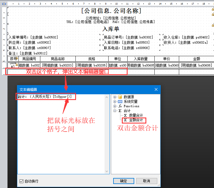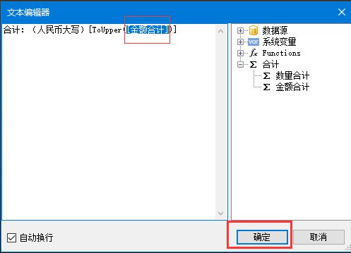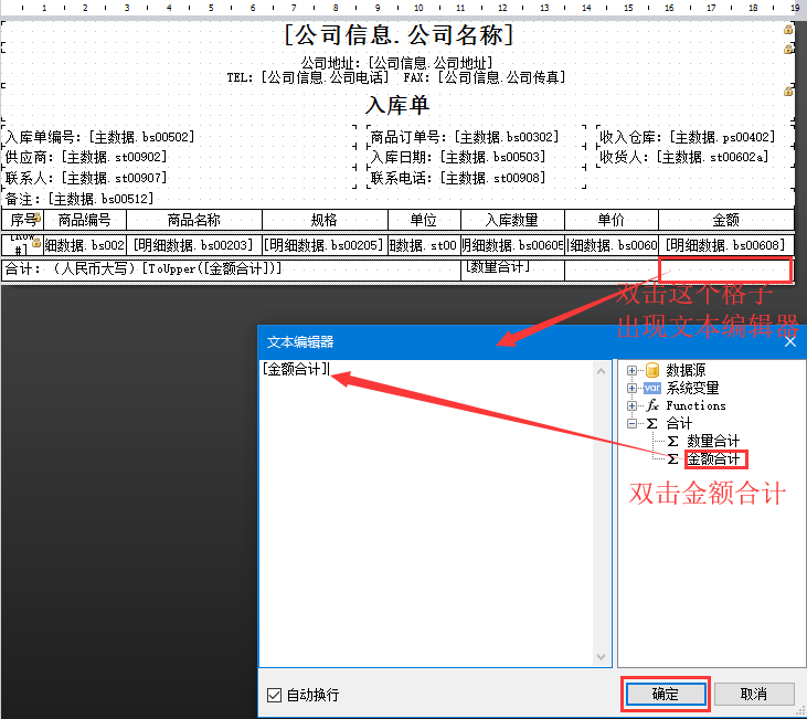9、同樣地,雙擊如下圖格子,彈出文本編輯器窗口,雙擊右側(cè)的金額合計(jì),然后點(diǎn)擊確定。