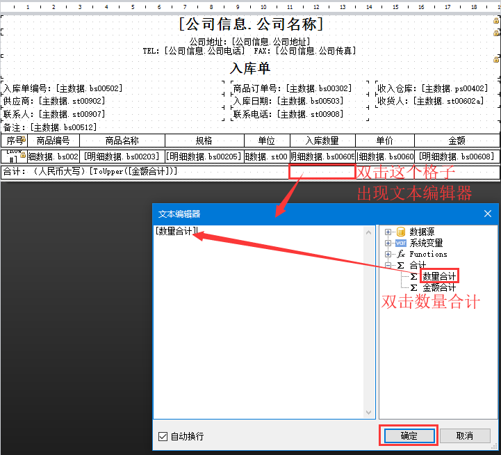 8、雙擊如下圖格子,彈出文本編輯器窗口,雙擊右側(cè)的數(shù)量合計(jì),然后點(diǎn)擊確定。