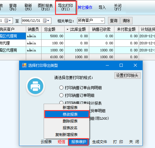 1、菜單欄點擊導(dǎo)出打印-報表維護-修改報表