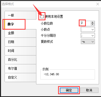3、在彈出的窗口中,左側(cè)點擊數(shù)字,取消掉使用本地設(shè)置的√,小數(shù)位設(shè)置為需要的小數(shù)位,然后點擊確定