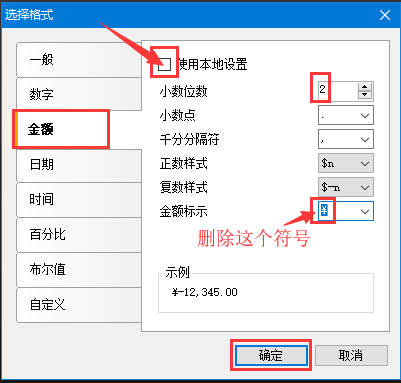 5、在彈出的窗口中,點擊左側(cè)的金額,取消掉使用本地設(shè)置的√,小數(shù)位設(shè)置為需要的小數(shù)位,然后刪除金額標(biāo)示(用鍵盤刪除鍵),然后點擊確定