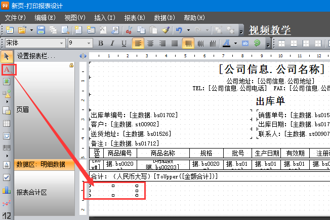 3、在左側工具欄,點擊A符號,如下圖所示,在報表合計區添加一個文本框