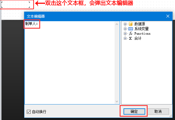 4、雙擊這個文本框,彈出文本編輯器,在此窗口中輸入“制單人:”,點擊確定