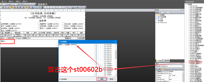 6、雙擊制單人文本框,彈出文本編輯器,參照右側的字段對應名稱,找到數據源-主數據,找到st00602b,雙擊這個字段,然后點擊確定