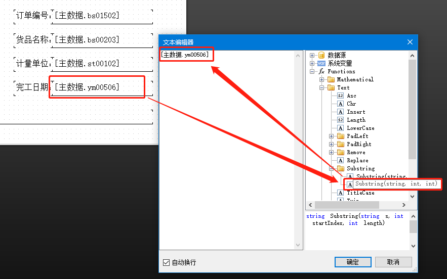 第二種方法:雙擊打開日期字段的文本框,點擊Function--text—Substring—Substring(sring,int,int),隨后雙擊選擇,最后將字段按照 [Substring(字段,0,10)] 的格式代入函數即可。