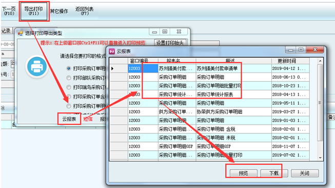 1.導出打印-云報表-預覽-選擇合適的報表下載-確定