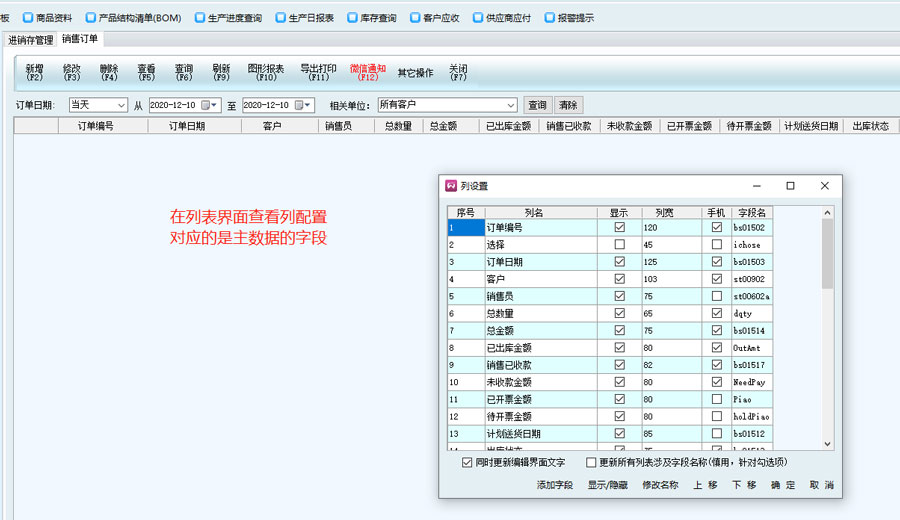 右鍵點擊明細數據的空白地區后,選擇點開列配置,在彈出窗口中查看明細數據對應的字段名。