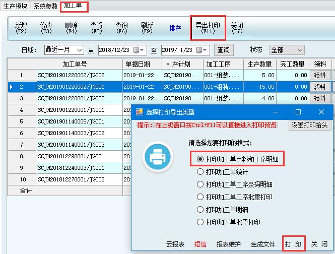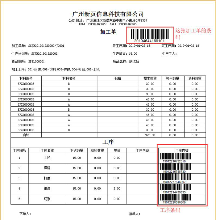 1)首先把該加工單打印出來,點擊菜單欄的導出打印,選擇報表打印加工單用料和工序明細,點擊打印,可見打印出來的報表如下圖(注意看加工單條碼和工序條碼)