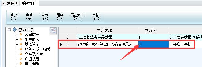 2)同樣地,在系統維護-系統參數,找到參數“驗收單、領料單啟用條碼快速錄用”,把參數值改為0,退出軟件,重新登錄。