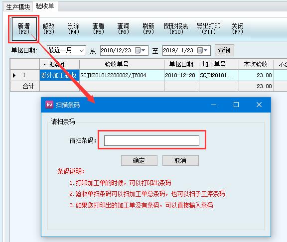 3)打開生產模塊-驗收單,點擊新增,彈出掃描條碼的窗口,把鼠標的光標放在下圖方框中,使用掃描槍掃加工單條碼或者工序條碼,可以快速驗收