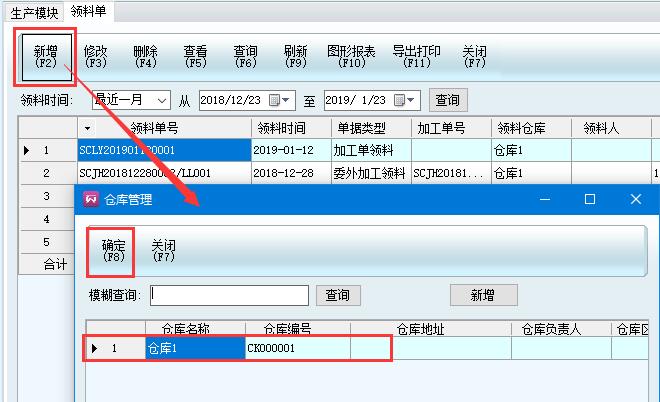 3)打開生產模塊-領料單,點擊新增,先選擇倉庫