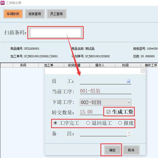 2)打開生產模塊-工序移交單,鼠標光標放在下圖方框中,用掃描槍掃描工序條碼,則會彈出如下窗口,信息無誤后,點擊確定,就完成了一個工序的移交。