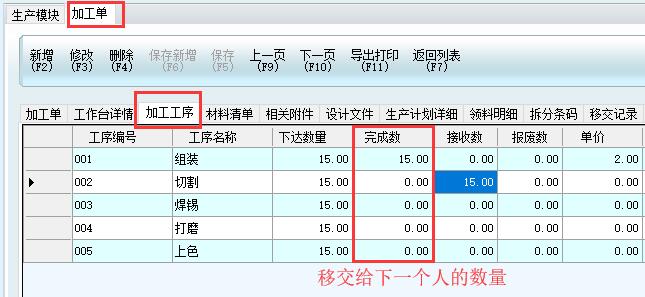 3)移交后,打開該加工單,可見加工單的工序完成情況如下圖。