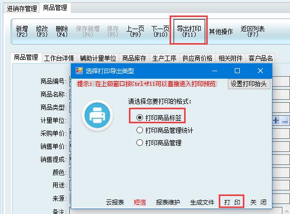 2)然后打印商品的條碼出來,菜單欄點擊導出打印,選擇打印商品標簽,打擊打印,如下圖打印出產品標簽