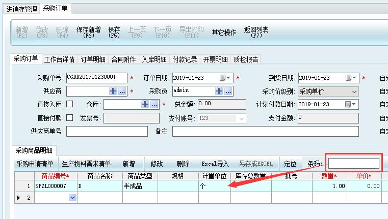 3)打開進銷存管理-采購訂單,點擊新增,如下圖,鼠標點擊條碼的方框,然后用掃描槍掃描產品條碼,則會帶出商品信息
