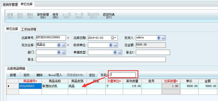 3)然后在做其他出庫單時,可以使用掃描槍進行出庫,鼠標點擊如下圖條碼方框,用掃描槍掃描唯一條碼即可。