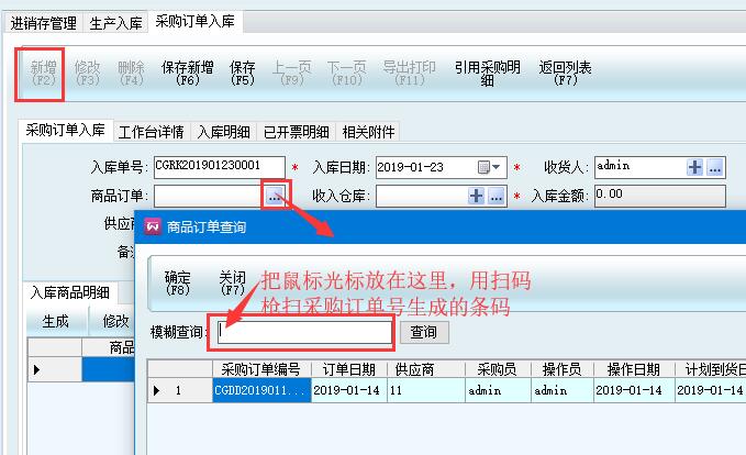 2)例如,采購入庫,打開采購訂單入庫,點擊新增,點擊商品訂單的…符號,在彈出的窗口中,鼠標點擊模糊查詢的方框,然后用掃描槍掃描采購訂單號條碼,即可快速選擇采購訂單進行入庫。(銷售訂單出庫操作雷同)