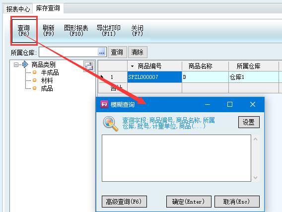 3)例如在庫存查詢,按鍵盤F6鍵,或者點擊菜單欄查詢按鈕,然后用掃描槍掃描產品的條碼,即可快速查詢到該產品