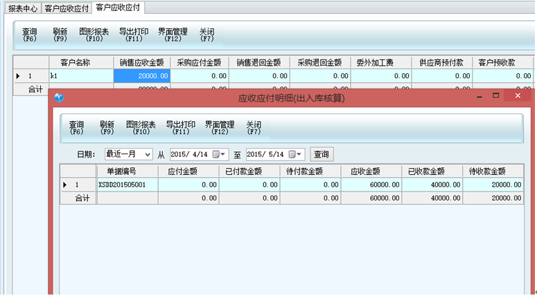 在報表中心應收應付里面可以查看客戶應收應付款,雙擊客戶可以看到已收款