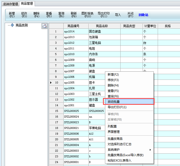 1、例如這里對商品資料進行批量處理,在商品管理列表點擊鼠標右鍵,選擇啟動批量