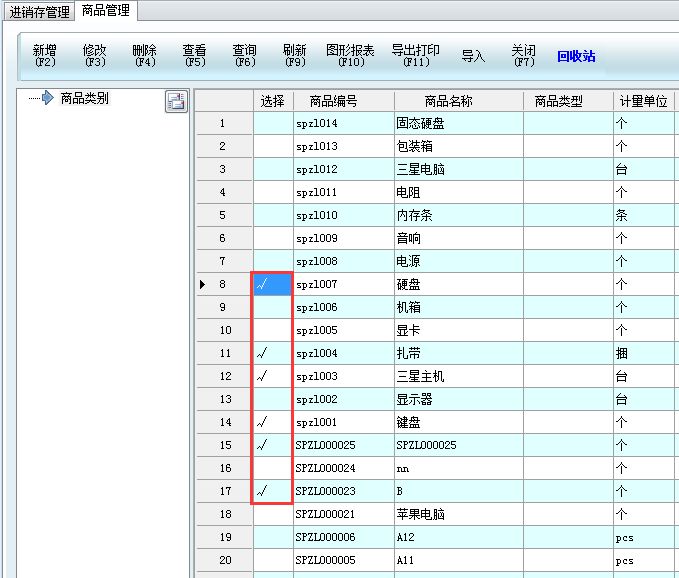 2、在每個商品前面都有一個空格,雙擊鼠標,勾選你需要批量處理的商品(如果需要全部選擇的,就再次點擊鼠標右鍵,選擇全選),如下圖,選好之后,就可以進行批量處理,例如,如果需要刪除選中的商品,則可以點擊菜單欄的刪除按鈕。