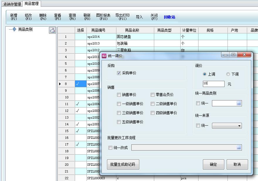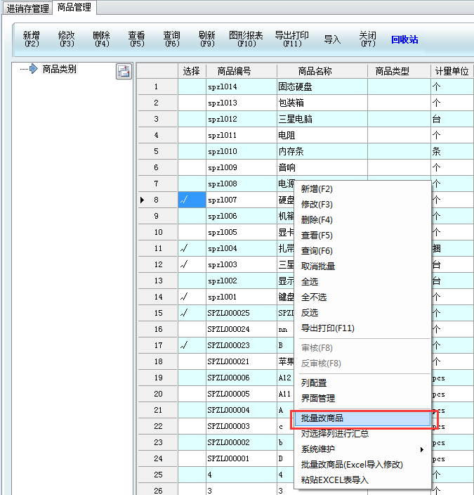 3、批量勾選商品之后,還可以對商品進行批量修改價格、工序。點擊鼠標右鍵,選擇批量改商品。
