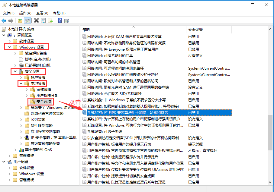 3、點(diǎn)擊“安全選項(xiàng)”后在右側(cè)窗口中找到“系統(tǒng)加密:將FIPS兼容算法用于加密、哈希和簽名”設(shè)置,然后雙擊它。