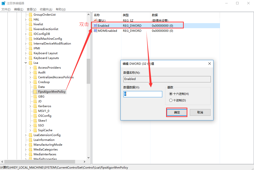 3、在右側(cè)窗口中雙擊“Enabled”數(shù)據(jù)數(shù)值改為0為禁用FIPS。